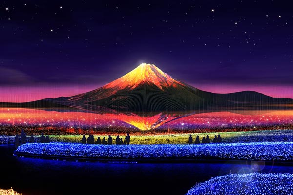 日本の美を象徴する景観や歴史、文化、伝統まで四季折々の感動的な情景をモチーフとし、世界に誇る雄大な富士山や日本各地の歴史ある景勝地のほか、古より人々により語り継がれてきた伝統や文化まで、数々のシーンをダイナミックに表現。日本が誇る色鮮やかな色彩をまとった浮世絵や、世代を超えて今もなお親しまれている昔ばなしも登場する、史上最多の複数シーンが見どころ。壮大で美しすぎる日本の情景を余すところなく表現するため、高さ約35m、横幅約155mというすべてを圧倒するスケールと、最新LEDによる最高峰のクオリティで、繊細かつ鮮やかな臨場感あふれる景観を表現。まさに後世に残したい「なばなの里」 だけで体験できるイルミネーションで魅せる美しい日本の情景の数々。